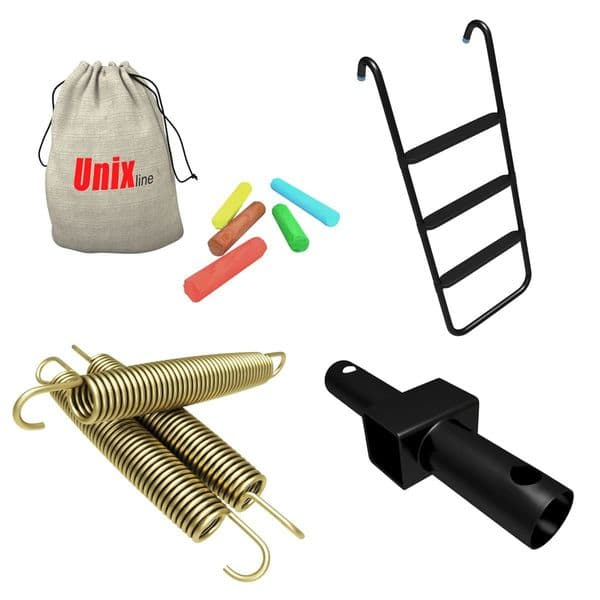 Помимо верхней защитной сетки, все батуты премиального модельного ряда UNIX line оборудованы нижней защитной сеткой, которая препятствует проникновению под прыжковое полотно батута детей, животных, а также попаданию посторонних предметов, и лестницей для удобства пользования. Так же в комплект входят специальные крепления батута к земле (колышки).